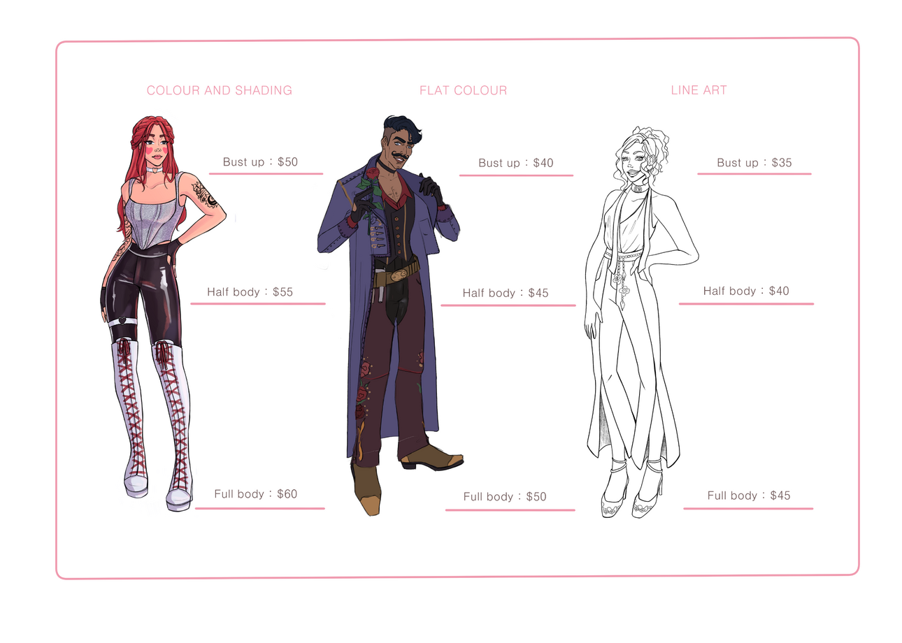 Prices listed on the artist’s Base Prices page may increase for any reason (such as art with extreme detail: mech, tattoos, armour, jewellery or patterns or complex backgrounds).